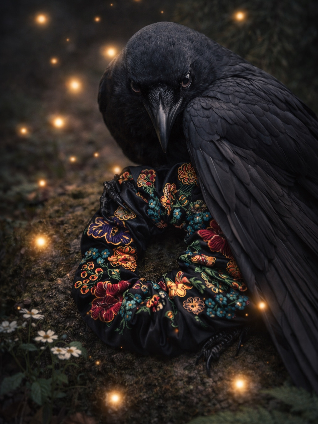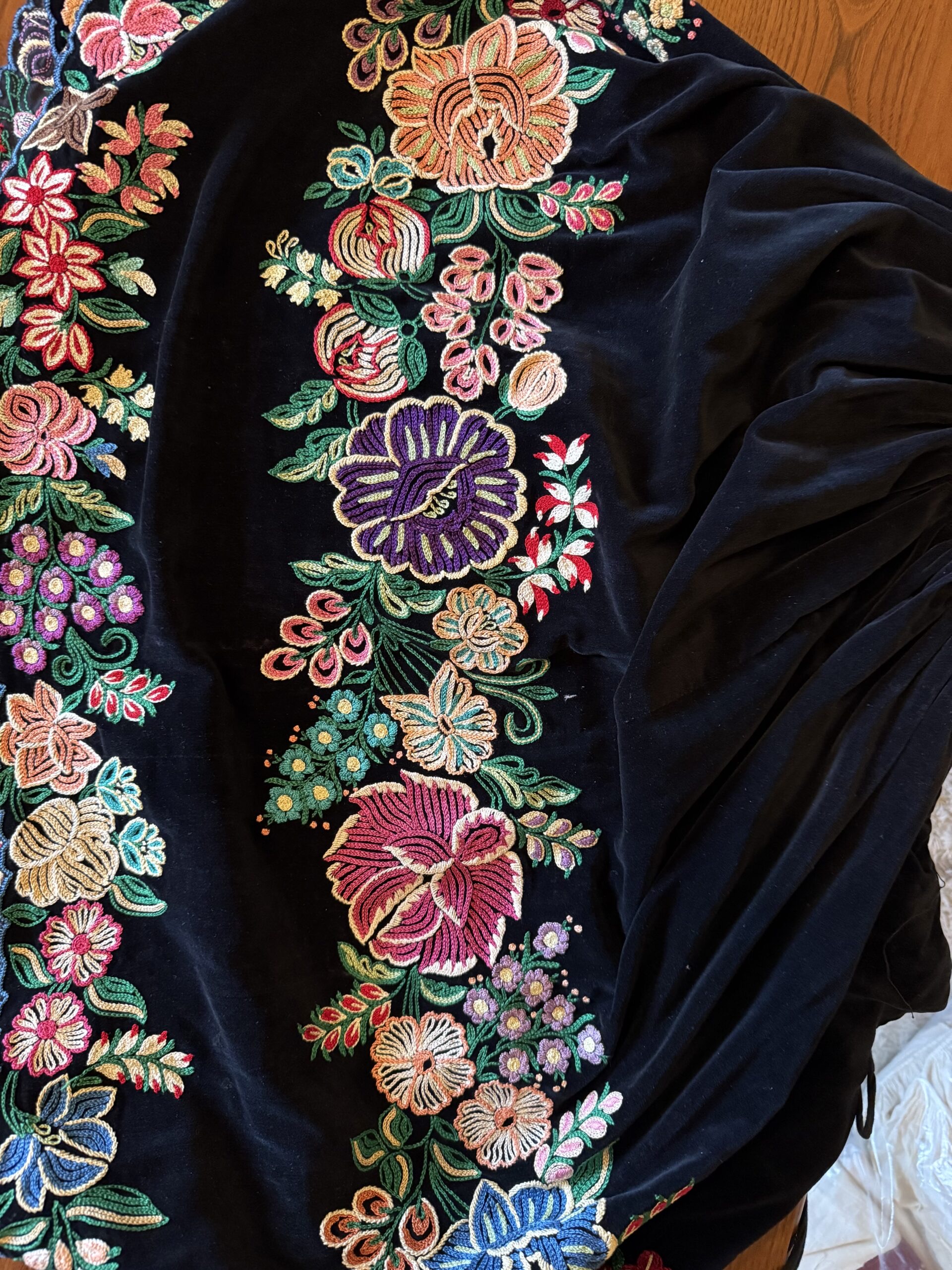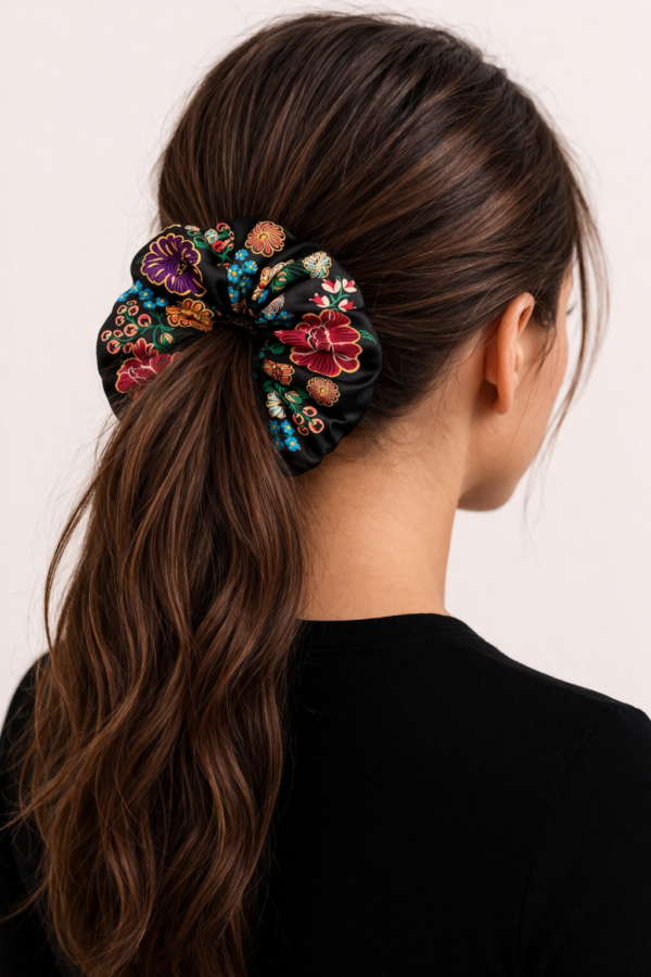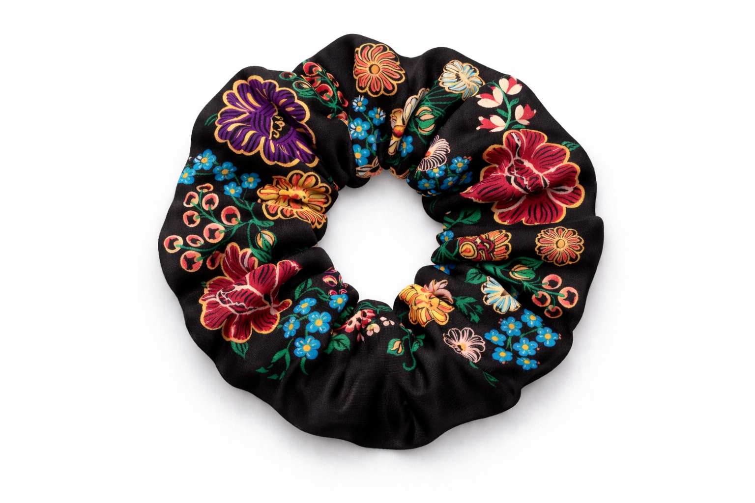 Jedinečná saténová gumička do vlasov (6 cm), inšpirovaná tradičnou výšivkou krivou ihlou z Podpoľania z obce Hrochoť.